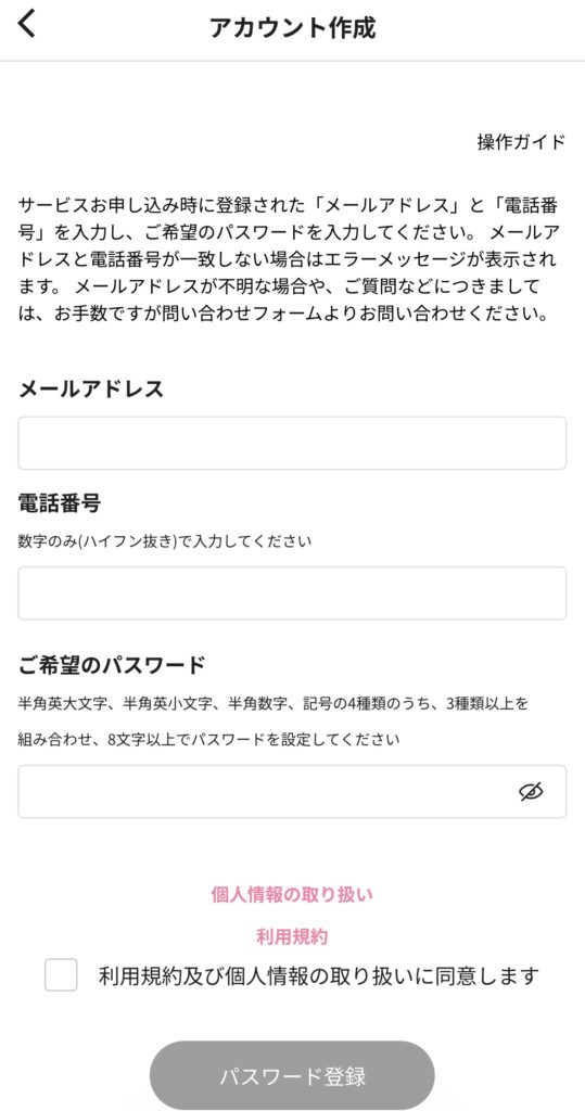 「利用規約及び個人情報の取り扱いに同意します」にチェックして、「パスワード登録」を押します