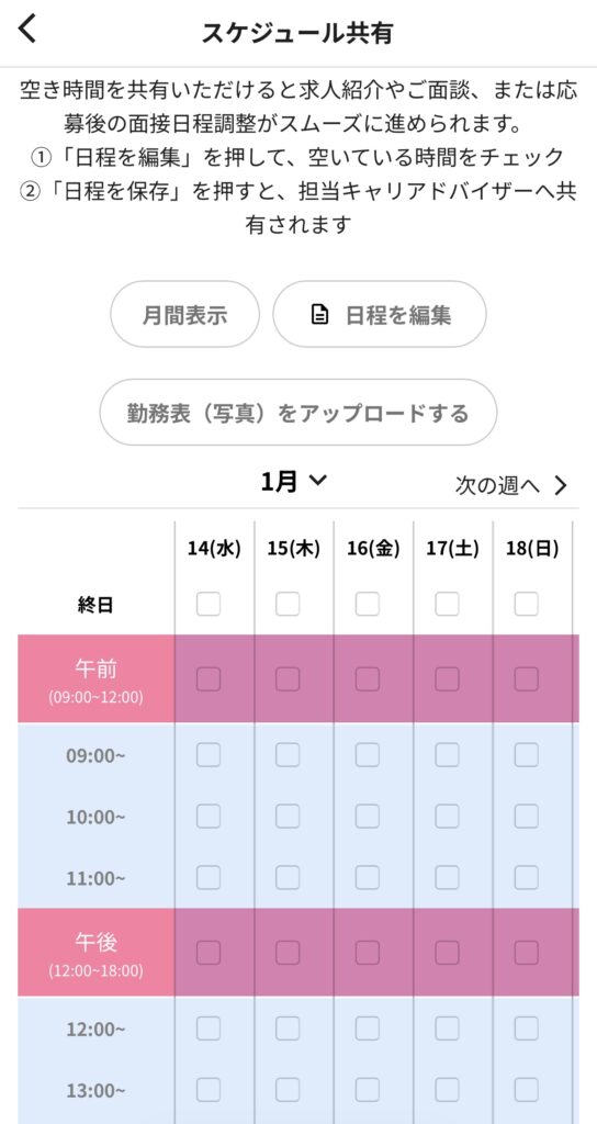 - 「日程を保存」を押して、キャリアアドバイザーと共有する
